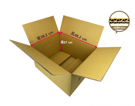 2 0101A325 48.2*38.2*27 棕色AB浪 厚度8mm 用途:宅配紙箱、搬家紙箱、收納紙箱,外徑:50x40x30CM,外徑總和:120CM,材質:五層AB浪 厚度:0.8CM,特色:手把孔|印有搬家資訊和警示標語 數量