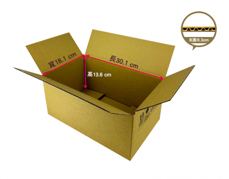 | 44 | 0101A315 | 30.1*18.1*13.6 | 棕色B浪 厚度3mm | 用途:超商紙箱、宅配紙箱,外徑:31x19x15CM,外徑總和:65CM,材質:三層B浪 厚度:0.3CM,特色:印有開箱錄影和警示標語 | 數量 | |||||