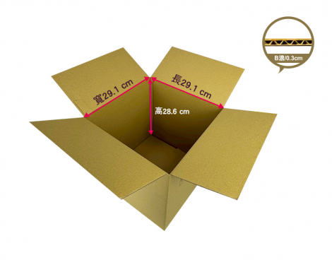 | 65 | 0101A321 | 29.1*29.1*28.6 | 棕色B浪 厚度3mm | 用途:超商紙箱、宅配紙箱,外徑:30x30x30CM,外徑總和:90CM,材質:三層B浪 厚度:0.3CM,特色:印有開箱錄影和警示標語,須知:若要購買空白箱,請搜尋賣場同尺寸,料號0101A019購買 | 數量 | |||||