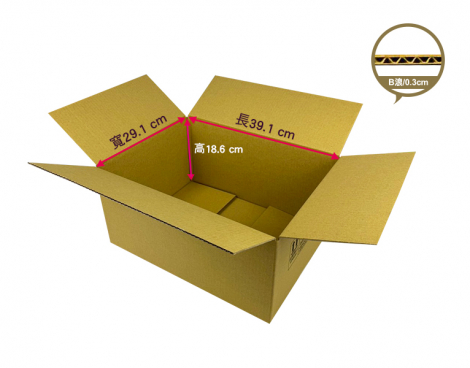 | 67 | 0101A323 | 39.1*29.1*18.6 | 棕色B浪 厚度3mm | 用途:超商紙箱、宅配紙箱,外徑:40x30x20CM,外徑總和:90CM,材質:三層B浪 厚度:0.3CM,特色:印有開箱錄影和警示標語,須知:若要購買空白箱,請搜尋賣場同尺寸,料號0101A035購買 | 數量 | |||||
