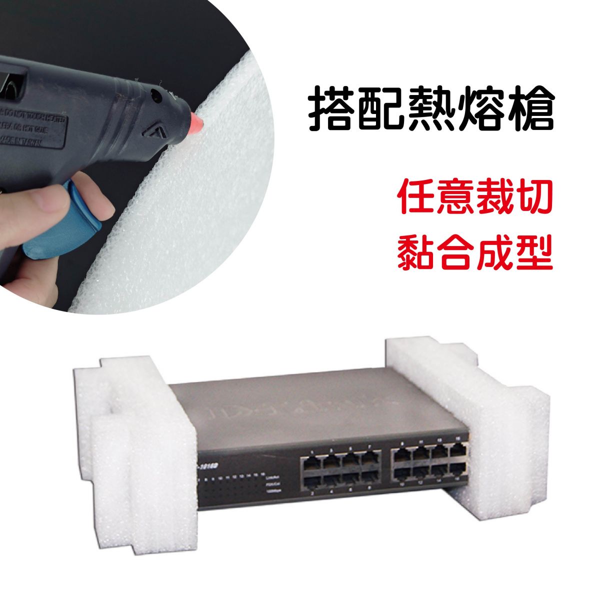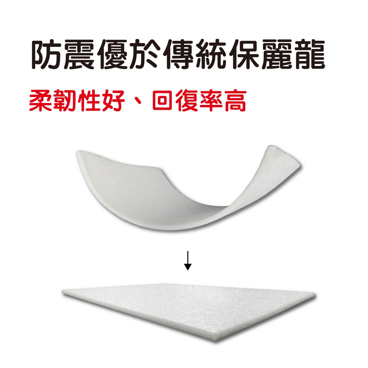 特色:環保材質,柔韌性好、回復率高、防震性能優於傳統保麗龍,搭配熱熔膠加工成各種形狀的緩衝包材