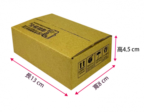 - 用途:超商紙箱、宅配紙箱,外徑:13x8x4.5CM,外徑總和:25.5CM,材質:三層B浪 厚度:0.3CM,特色:印有開箱錄影和警示標語